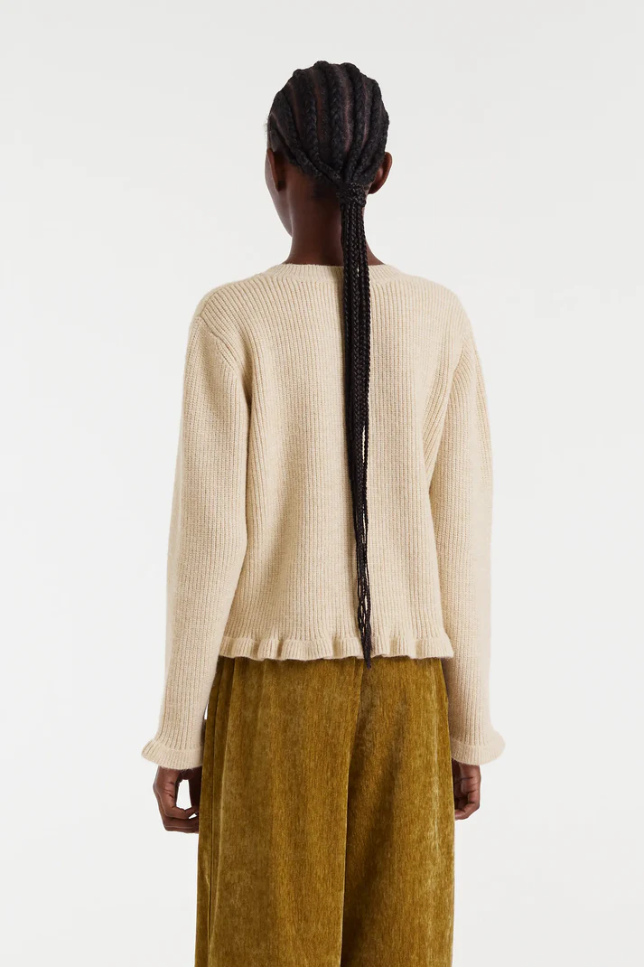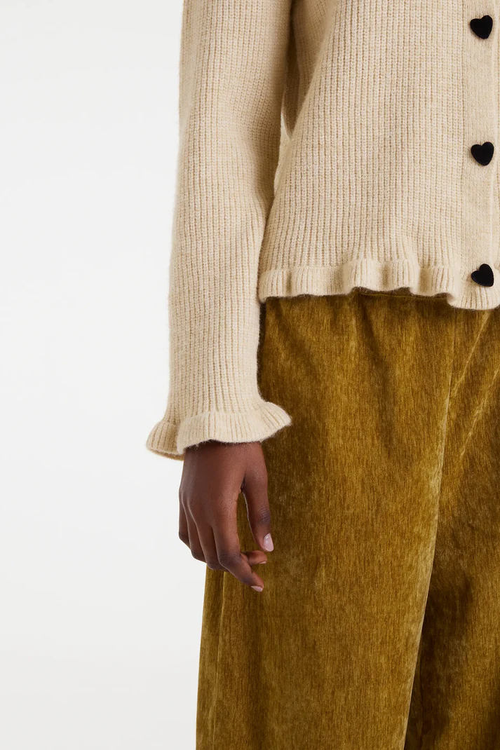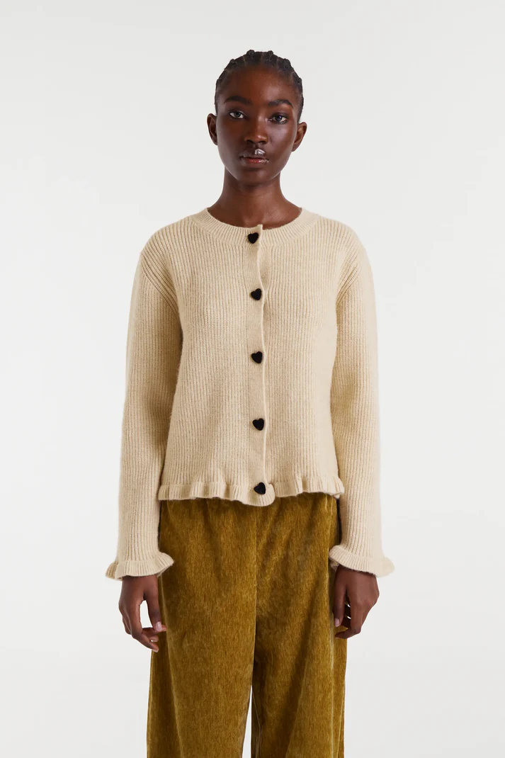 Beige cardigan in soft knit fabric. Features a round neck and long sleeves with ruffled cuffs. Button closure with heart-shaped buttons. Ruffled details at the hem and ribbed trim. The model is 178 cm tall and wears size S.