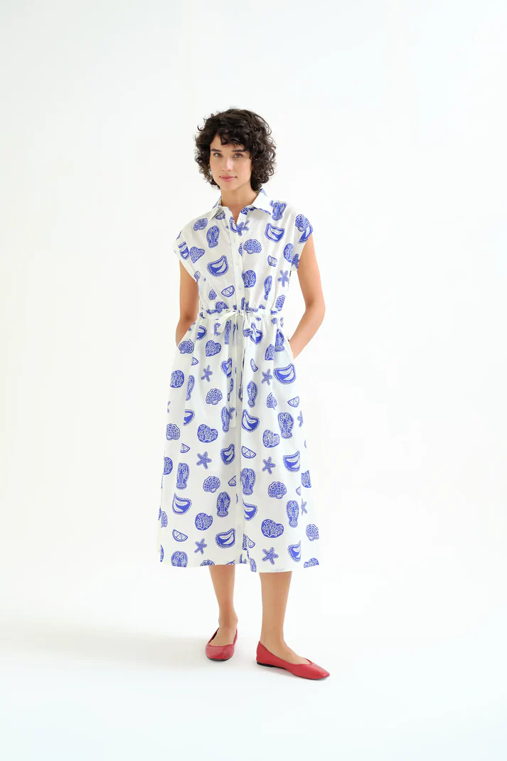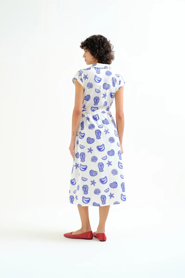 100% cotton dress with a lobster print. Lapel collar and short sleeves. White button front closure. Adjustable waist. Lined. The model is 175 cm tall and wears size S.
