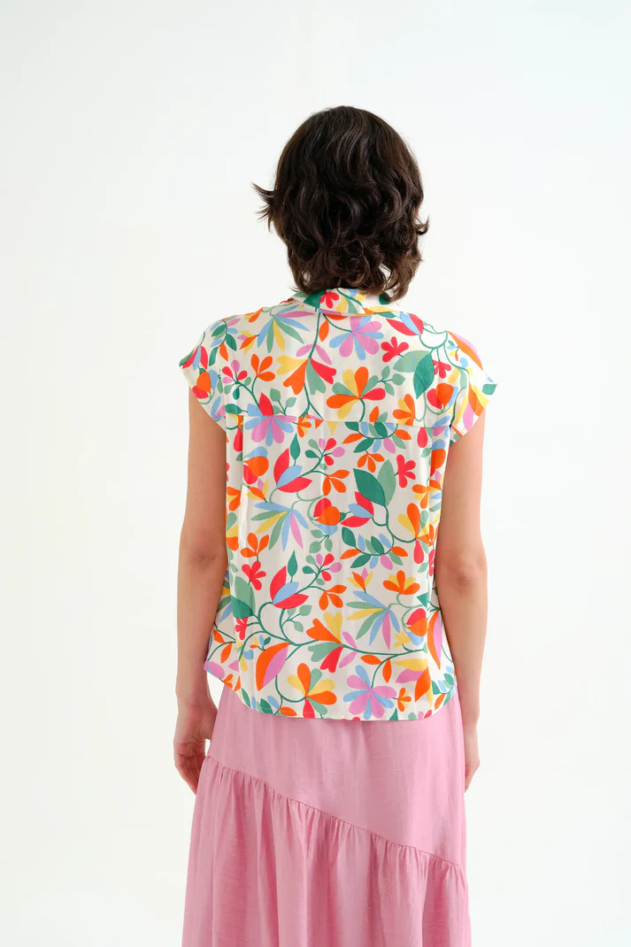 Shirt with lotus print fabric. Lapel collar and short sleeves. Front closure with concealed white buttons. The model is 177 cm tall and wears size S.