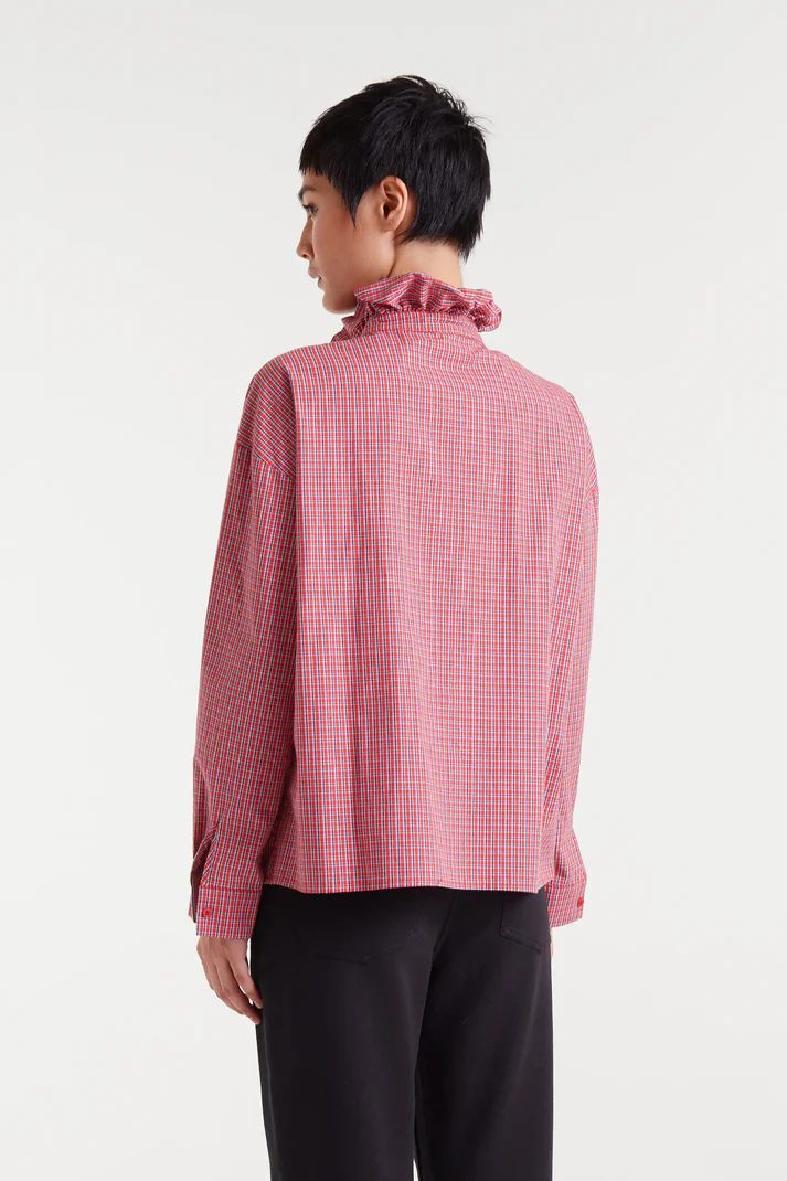 100% cotton shirt with a red gingham print. High ruffled collar and long sleeves with buttoned cuffs. Front button closure with ruffle detailing. The model is 177 cm tall and is wearing a size S.