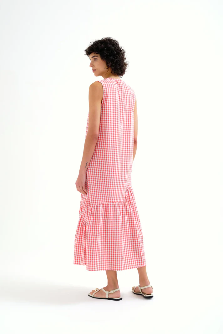 Red gingham dress made from 100% cotton. Square neckline and thick straps. Asymmetrical cut. The model is 175 cm tall and wears size S.