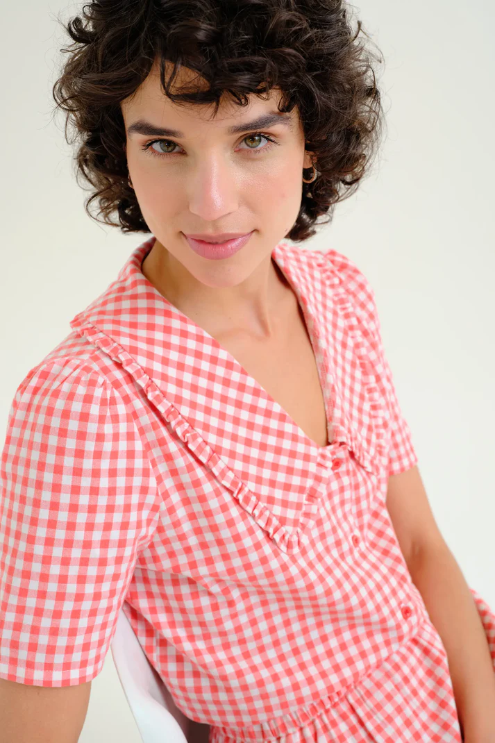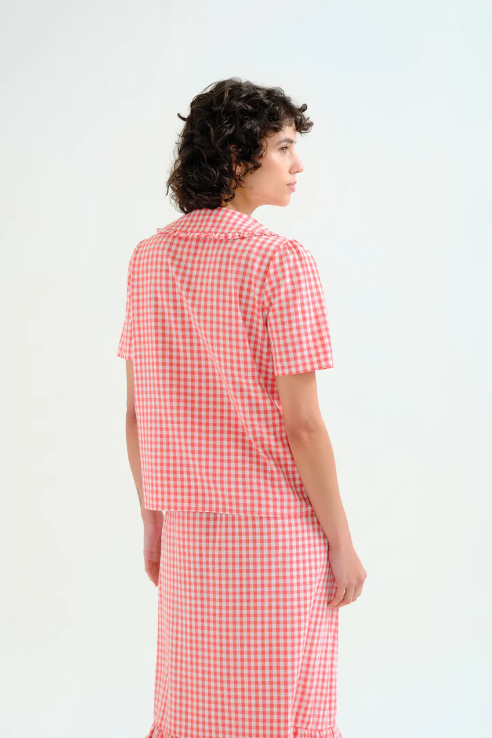 Red gingham shirt made from 100% cotton. Peter Pan collar and short sleeves. Front button closure with red buttons. The model is 175 cm tall and wears size S.