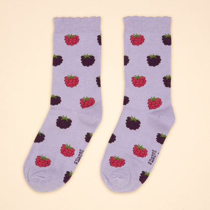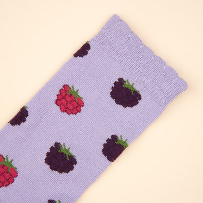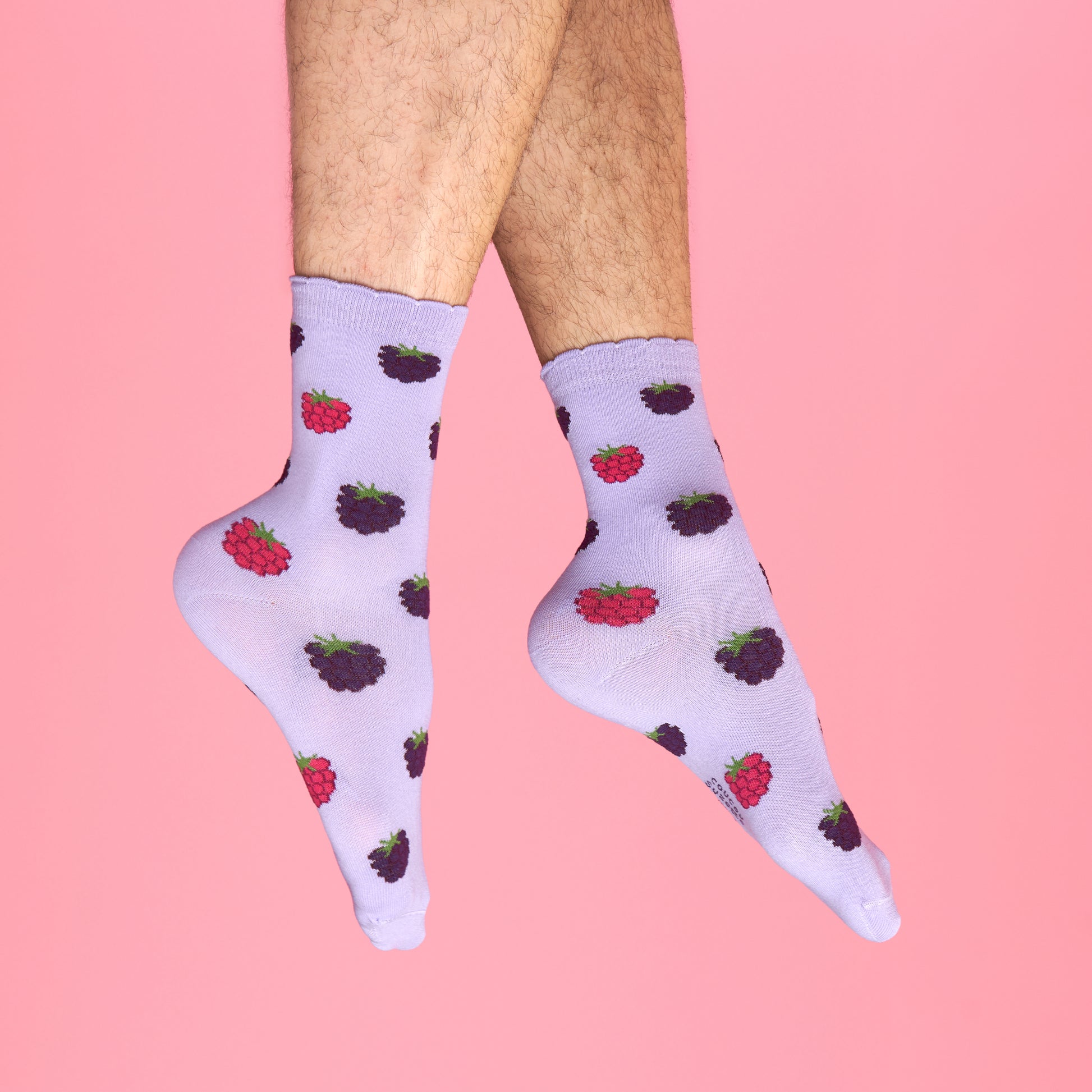 After a harsh winter, we’re filling up on vitamins and antioxidants with these berries socks: a mix of raspberries and blackberries on a lilac background, with extra pleats around the ankle. We’re all dressed up for spring!