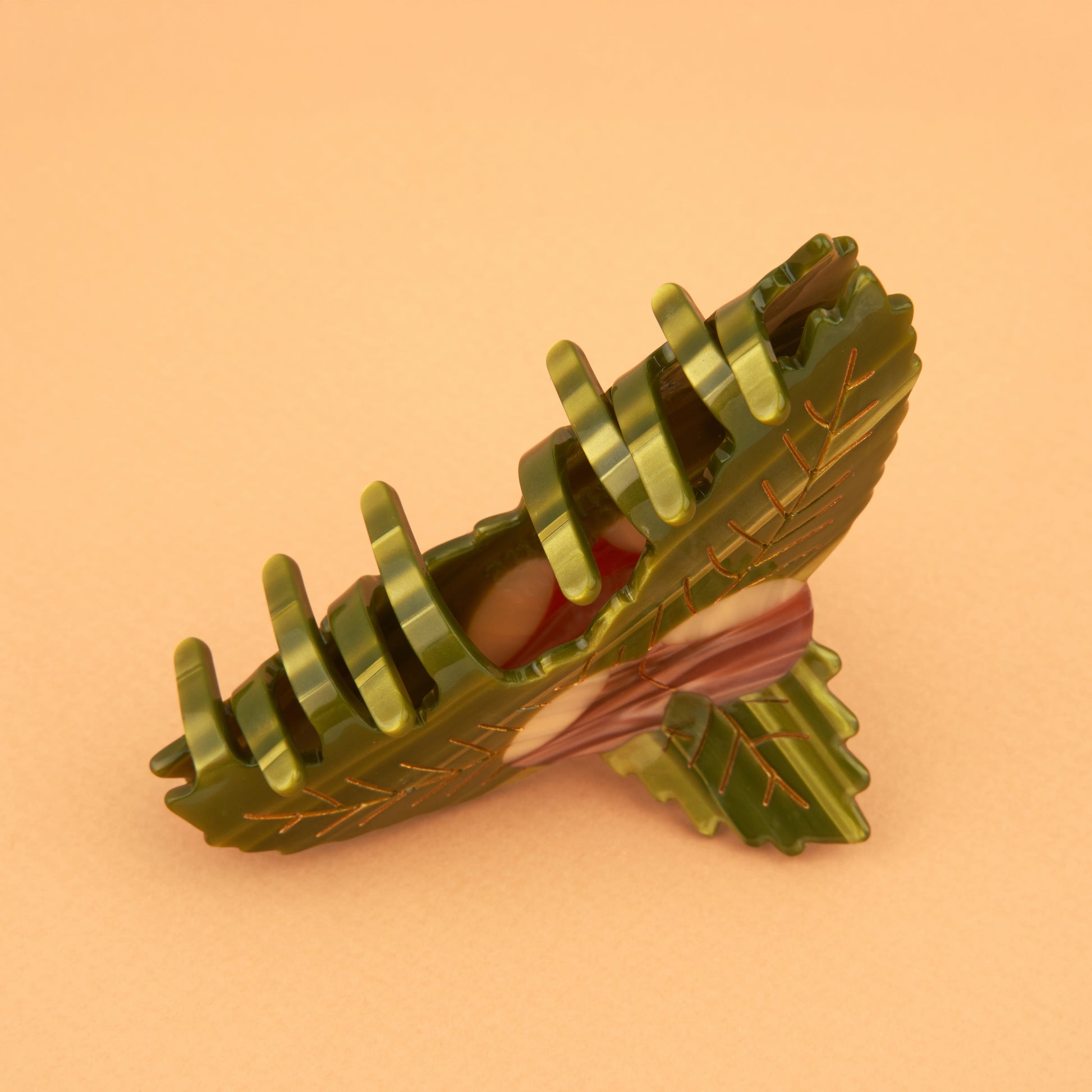 For all the big hair claw lovers out there, here comes the Chestnut Hair Claw! Three beautiful metallic green leaves – inspired by our classic leaf claw – joined by two cute little chestnuts, ready to be roasted and devoured. Perfect for long, thick hair and all your cozy autumn hairstyles.