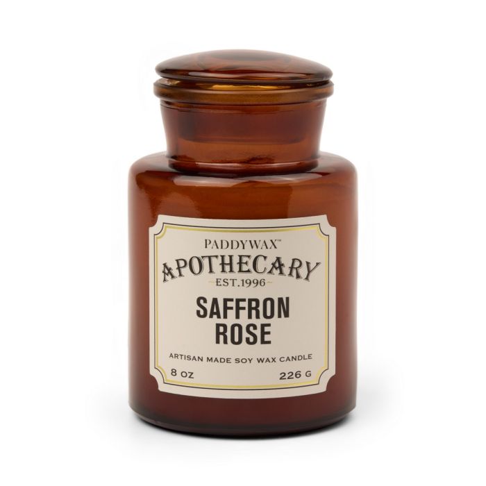 Soy Wax candle hand-poured in a 8 oz. vintage-inspired amber apothecary bottle. T: Bergamot, Berry. M: Jasmine, Rose, Saffron. B: Ambergris, Oakmoss, Amber. Approximate burn time 50+ hours.